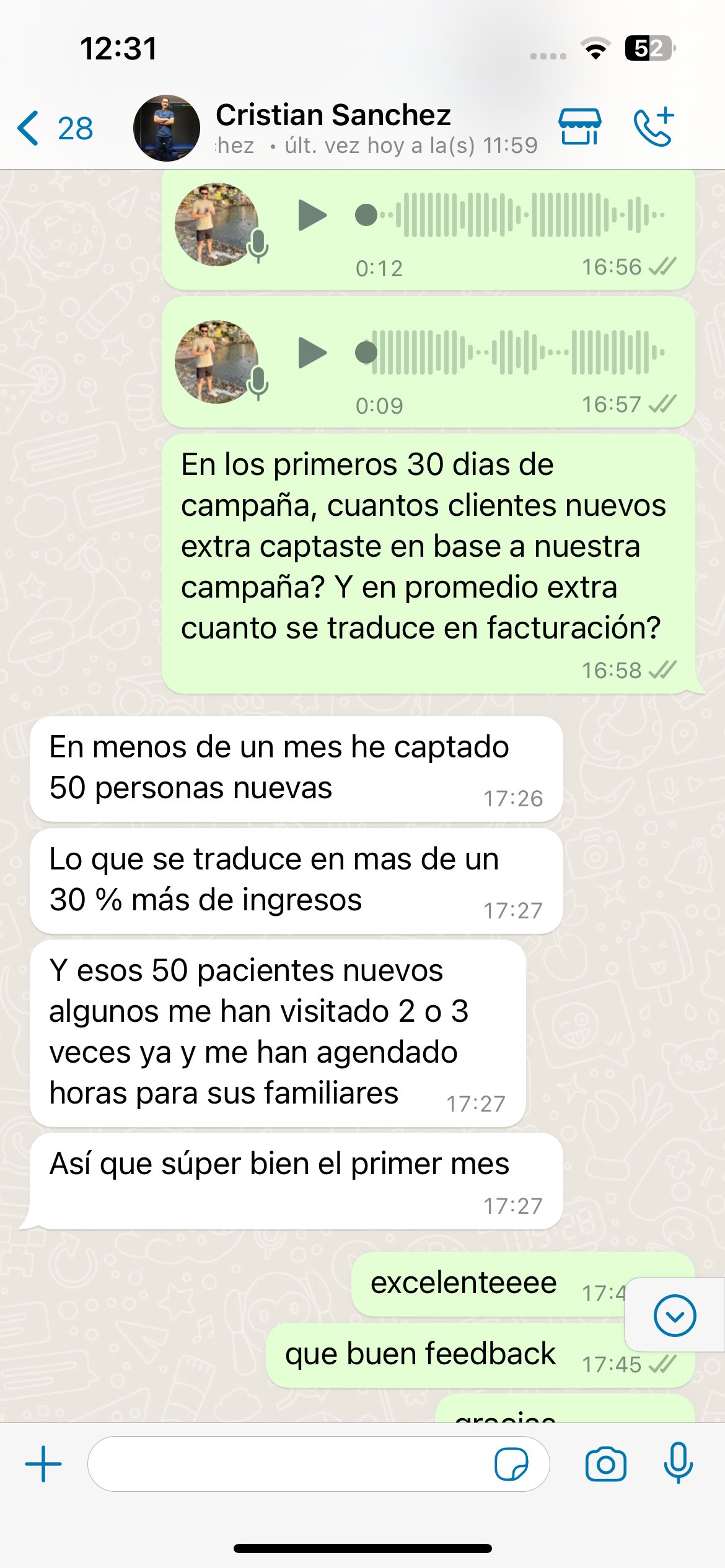 ResultadoPasó de no usar redes sociales a tener videos virales que atraen más de 30 pacientes al mes fácilmente.